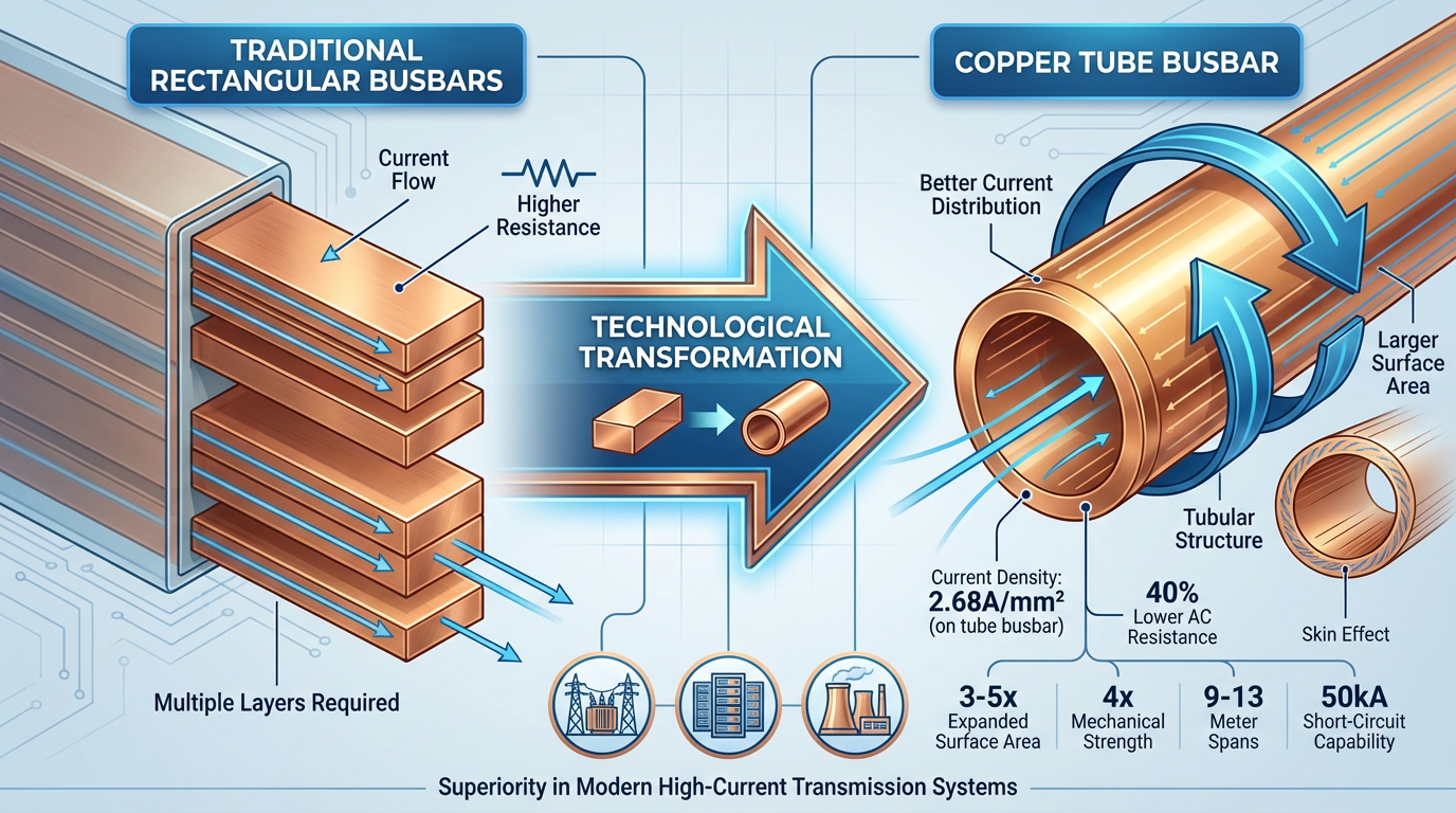 Peningkatan infrastruktur tenaga global memacu permintaan yang tidak pernah berlaku sebelum ini tiub kuprum bar bas. Walaupun hanya mewakili 2%–3% daripada jumlah permintaan tiub kuprum, produk ini mengalami kadar pertumbuhan melebihi 200% setiap tahun dalam aplikasi seperti pencawang voltan ultra tinggi, pusat data dan loji kuasa tenaga baharu. Kelebihan teras terletak pada mereka struktur tiub berongga , yang mengembangkan luas permukaan konduktor sebanyak 3-5 kali, memastikan pengedaran arus seragam di sepanjang dinding tiub, mengurangkan pekali kesan kulit di bawah 0.8, dan mengurangkan rintangan AC sebanyak 40% berbdaning bar bas segi empat tepat dengan luas keratan rentas yang setara.