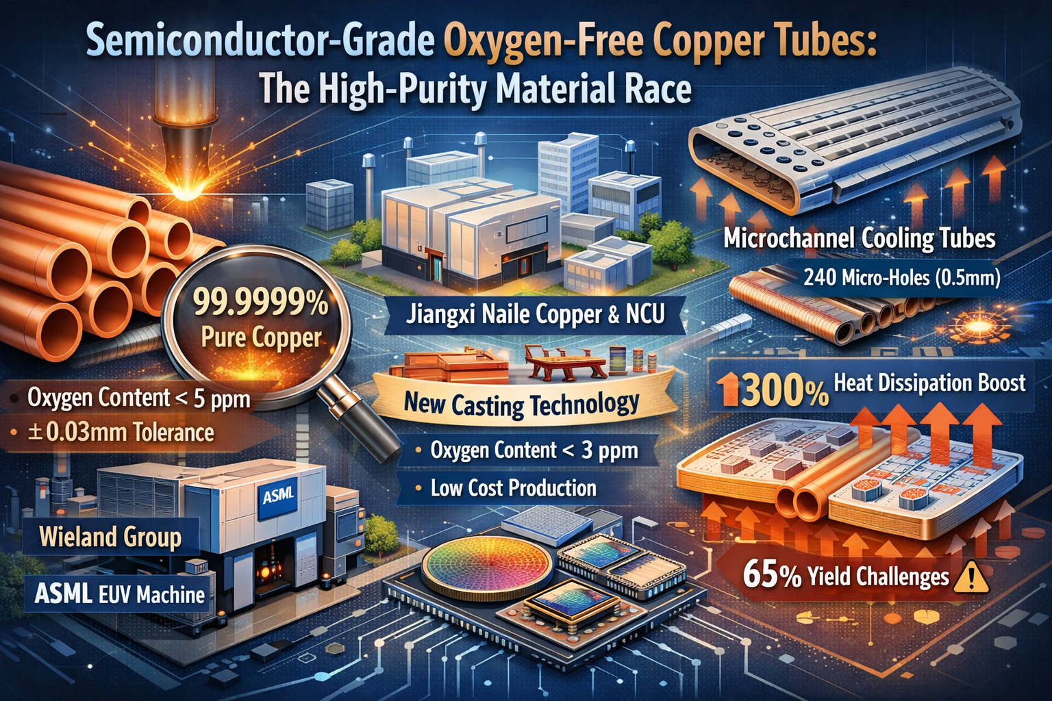 Terobosan dalam kos efektif alternatif muncul. Jiangxi Naile Copper, dengan kerjasama Universiti Nanchang, membangunkan "kaedah tuangan berterusan mendatar split oksigen ultra-rendah" yang mengawal kandungan oksigen di bawah 3ppm pada satu perlapan kos kaedah vakum yang diimport. Inovasi ini telah memasuki rantaian bekalan untuk barisan pengeluaran 14nm SMIC. Aplikasi yang lebih maju termasuk tiub penyejukan tahap wafer dengan reka bentuk saluran mikro (cth., 240 lubang mikro berdiameter 0.5mm) untuk meningkatkan kecekapan pelesapan haba sebanyak 300%, walaupun kadar hasil kekal sebagai cabaran pada 65%.