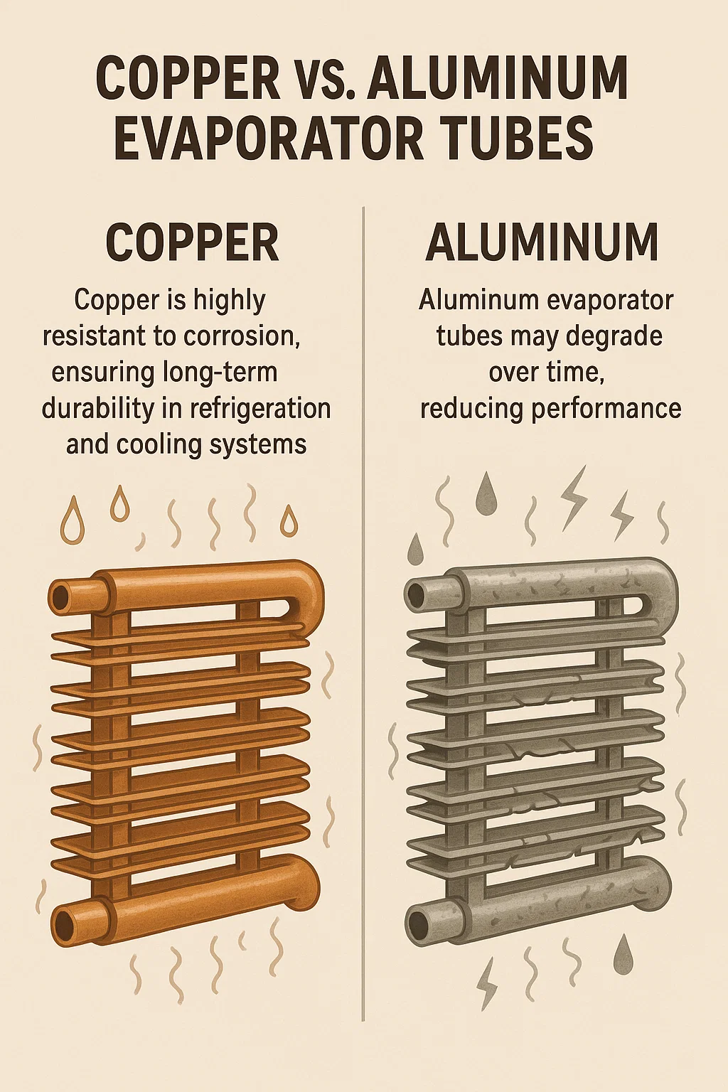 Aluminium , sebaliknya, lebih mudah terdedah pengoksidaan dan kakisan , terutamanya dalam persekitaran di mana ia terdedah kepada kelembapan atau kelembapan yang tinggi. Dari masa ke masa, tiub penyejat aluminium boleh merendahkan, mengurangkan prestasi mereka dan memerlukan penyelenggaraan atau penggantian yang lebih kerap.