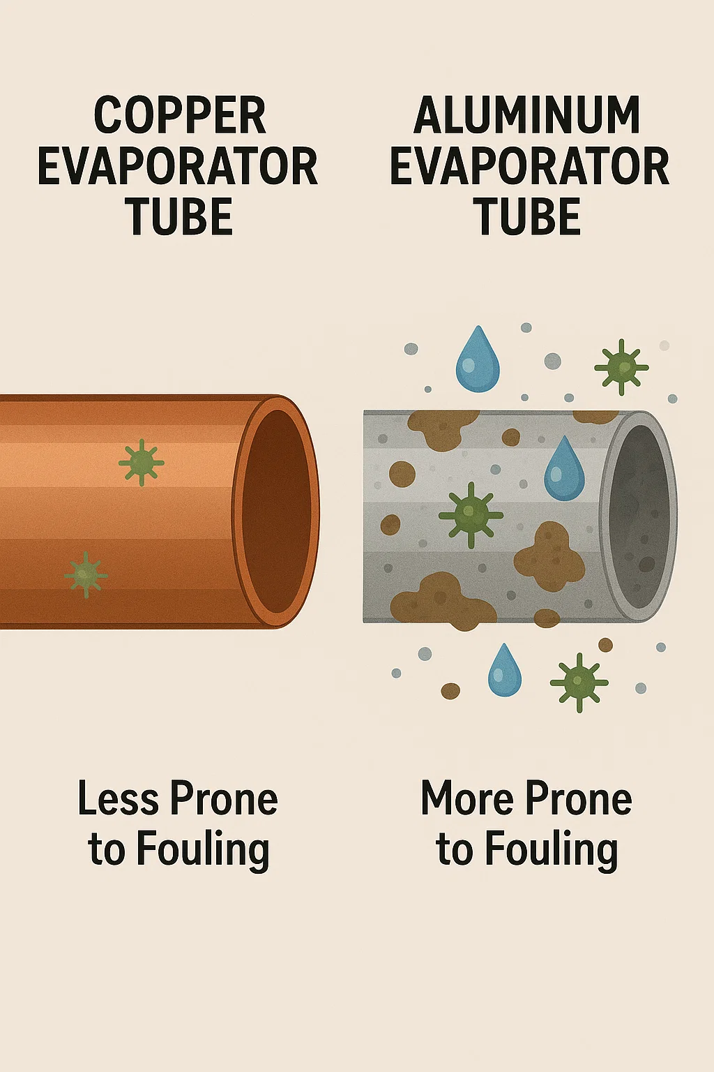 Tembaga mempunyai sifat antimikrob semulajadi yang membantu mencegah pertumbuhan bakteria, kulat, dan alga di permukaannya. Rintangan ini terhadap fouling menyimpan tiub penyejat tembaga yang bersih dan lebih cekap dari masa ke masa, mengurangkan kekerapan pembersihan dan penyelenggaraan.