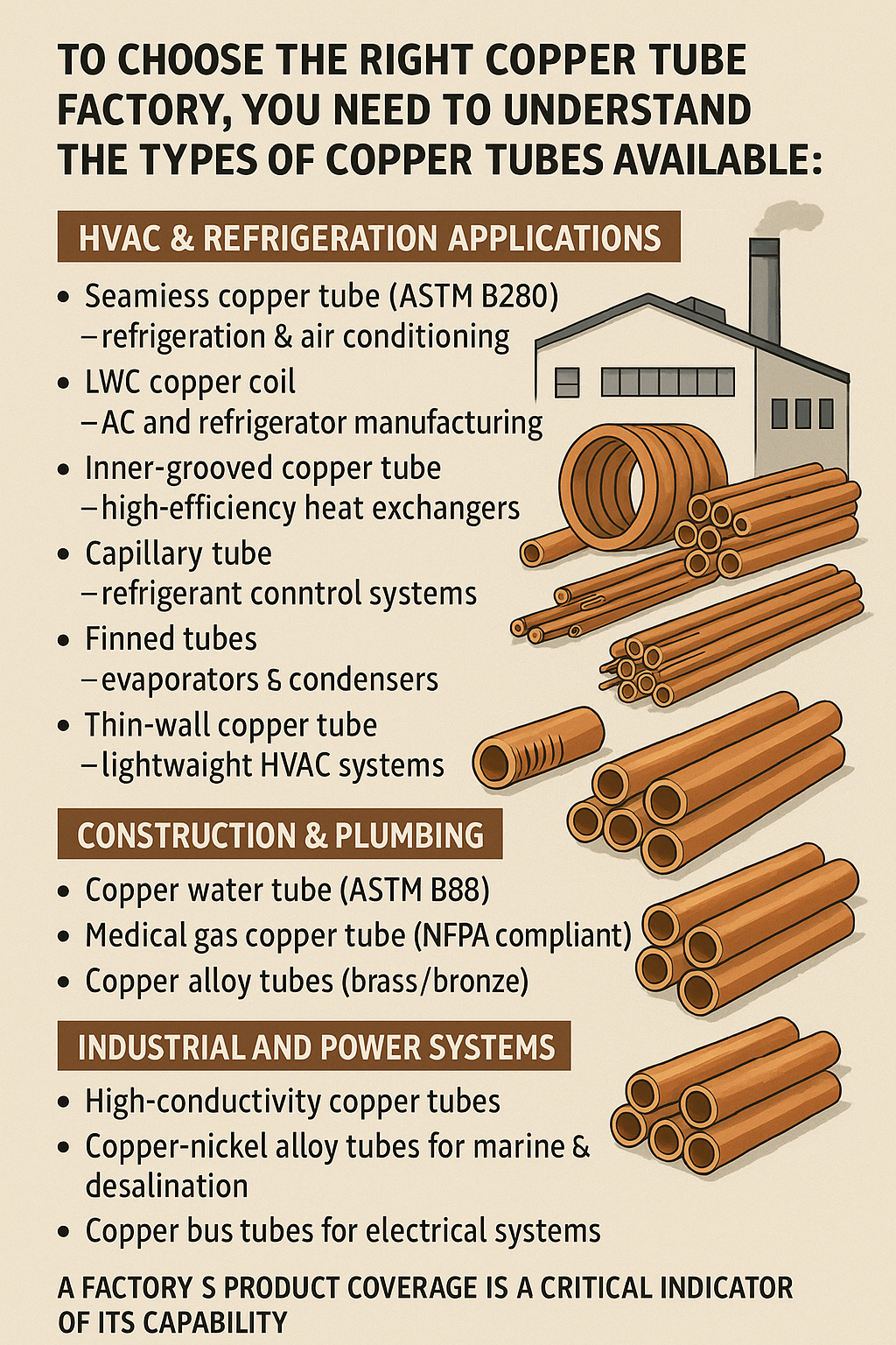 Tiub tembaga, kerana kekonduksian terma yang sangat baik, rintangan kakisan, dan kemuluran, digunakan secara meluas dalam banyak industri, seperti pembinaan, penyejukan, HVAC (pemanasan, pengudaraan, dan penghawa dingin), automotif, dan elektronik. Berikut adalah jenis biasa tiub tembaga dan aplikasi mereka: