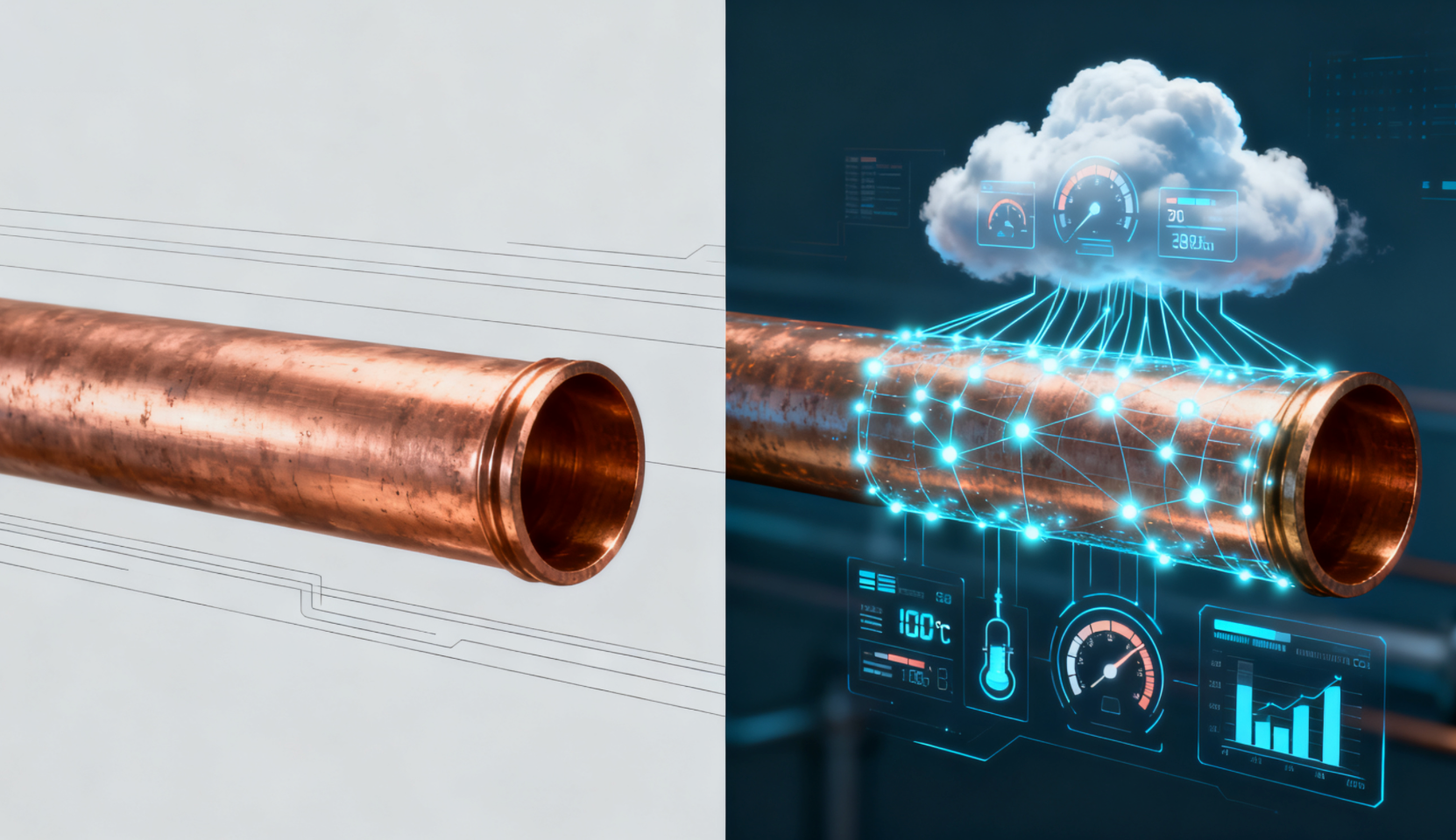 Kapsyen: Metamorfosis identiti: Dari paip senyap di sebelah kiri ke nod data "bercakap" di sebelah kanan, nilai tiub tembaga sedang ditakrifkan semula oleh teknologi digital.