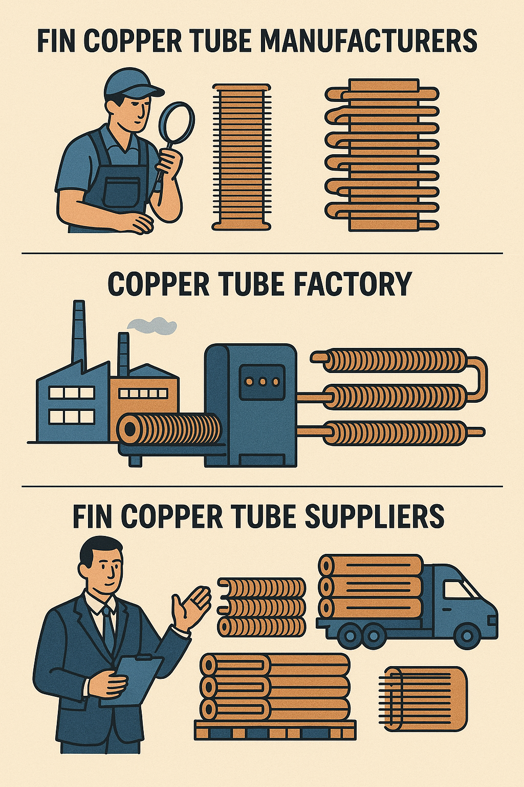 Pengeluar Tiub Tembaga Fin bertanggungjawab untuk menghasilkan tiub kuprum berkualiti tinggi yang direka khusus untuk aplikasi pertukaran haba. Pengeluar ini bekerja dengan teknik pengeluaran termaju untuk mencipta tiub yang tahan lama, cekap dan menjimatkan kos. Peranan mereka dalam rantaian bekalan adalah penting, kerana mereka memastikan bahawa bahan memenuhi piawaian industri dan spesifikasi pelanggan.