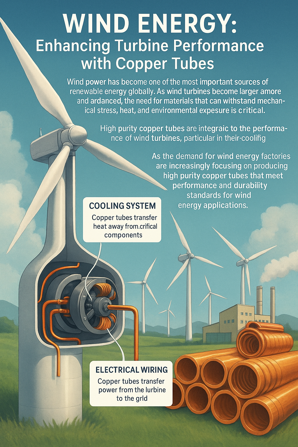 Kuasa angin telah menjadi salah satu sumber tenaga boleh diperbaharui yang paling penting di seluruh dunia. Oleh kerana turbin angin menjadi lebih besar dan lebih maju, keperluan bahan -bahan yang dapat menahan tekanan mekanikal, haba, dan pendedahan alam sekitar adalah kritikal. Tiub tembaga kemurnian tinggi adalah penting untuk prestasi turbin angin , terutamanya dalam mereka Sistem penyejukan dan komponen elektrik.