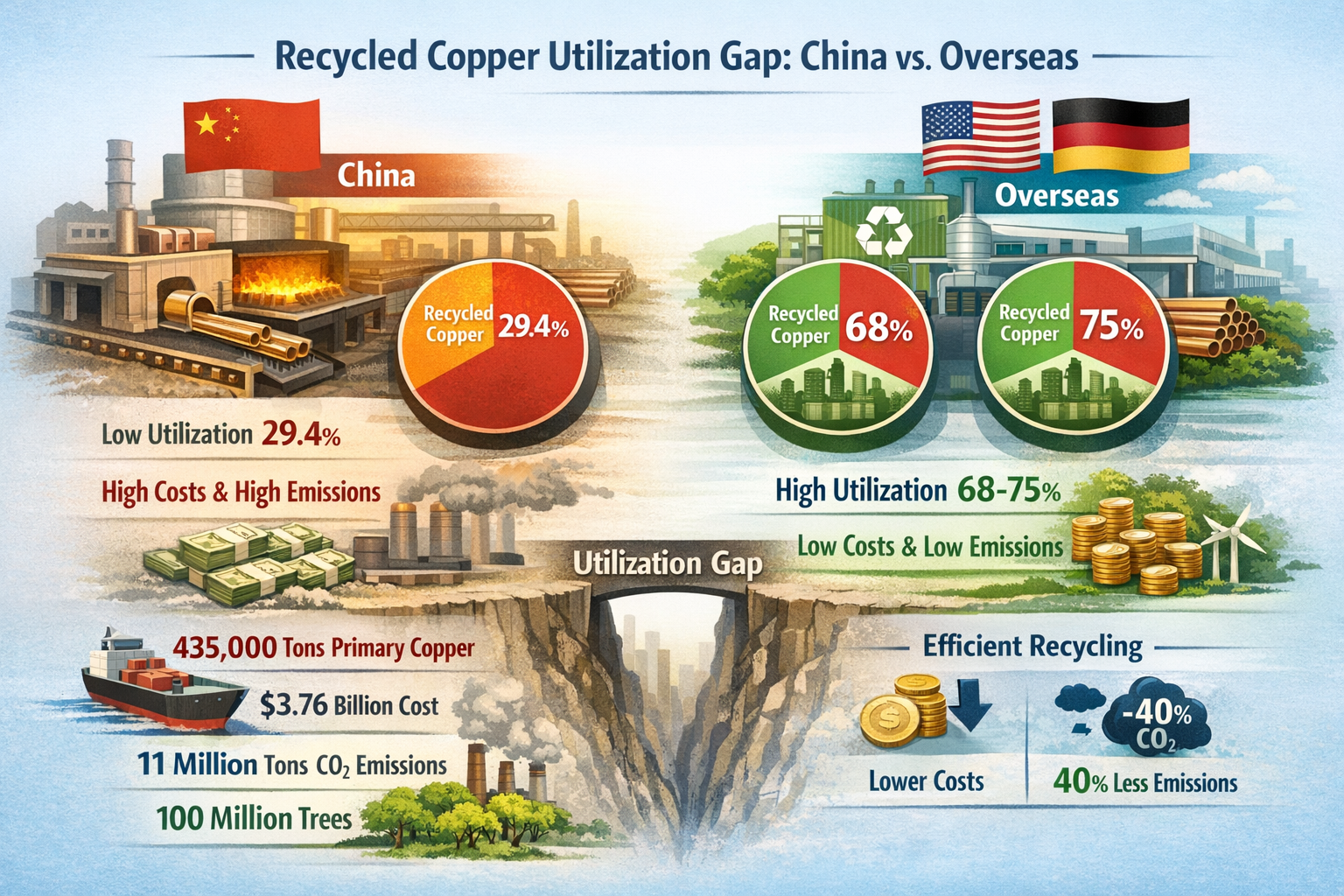 Jurang dalam nisbah penggunaan kuprum kitar semula secara langsung diterjemahkan ke dalam jurang dalam kos and daya saing alam sekitar . Berdasarkan unjuran pengeluaran tiub tembaga domestik sebanyak 1.423 juta tan pada 2025, meningkatkan kadar penggunaan tembaga kitar semula kepada 50% boleh mengurangkan pergantungan kepada tembaga primer yang diimport sebanyak 435,000 tan, menjimatkan kira-kira AS$3.76 bilion dalam perbelanjaan pertukaran asing, di samping mengurangkan pelepasan karbon kepada lebih 1 juta kepada lebih 1 juta pelepasan karbon kepada loji. 100 juta pokok. Walau bagaimanapun, pada hakikatnya, kebanyakan syarikat tiub tembaga domestik masih mematuhi struktur bahan mentah " terutamanya tembaga primer, ditambah dengan tembaga kitar semula ," hanya menambah sejumlah kecil kuprum kitar semula kepada produk tiub kuprum konvensional yang bernilai rendah, manakala produk tiub kuprum mewah bergantung sepenuhnya pada kuprum primer.